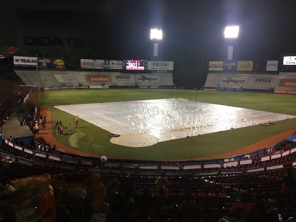La lluvia demoró el inicio del partido y, en el quinto capítulo provocó su suspensión. FOTO: Cardenales de Lara