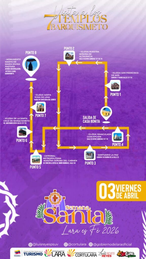 Bajo el lema «Lara es Fe 2026», las autoridades regionales y de turismo presentaron el itinerario oficial para la tradicional Visita a los 7 Templos, que se llevará a cabo este viernes 03 de abril. El recorrido, que forma parte esencial de la programación de Semana Santa en la capital larense, contempla ocho paradas estratégicas que fusionan la espiritualidad con la identidad histórica de la ciudad.