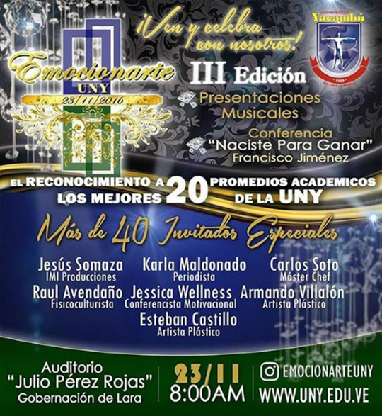 La Universidad Yacambú, en conformidad con los estudiantes de Comunicación Social periodo 2016-3, dan continuidad a la tercera edición del festival “Emocionarte UNY”; evento que se llevará a cabo este 23 de Noviembre a las 8:00am en el auditorio “Julio Pérez Rojas”, ubicado en la Gobernación del estado Lara.